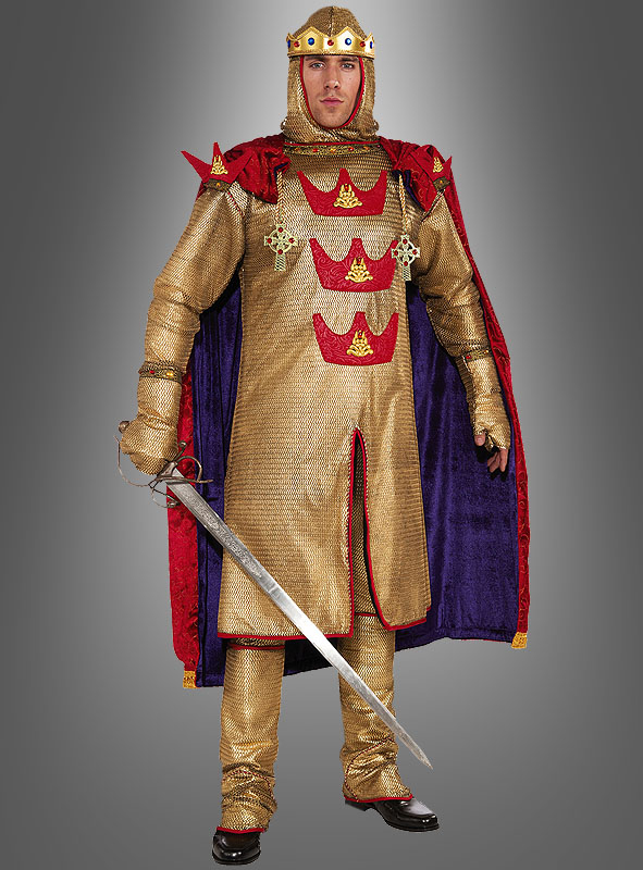 Deluxe Designer Collection in Theaterqualität. Komplettkostüm in toller Qualität. Lange Tunika aus goldenem, nichtdehnbarem Stoff in Kettenhemd-Optik. Der goldene Stoff ist leicht gepolstert. Auf der Brust sind mit rotem Stoff drei Kronen appliziert, die zusätzlich mit Edelsteinen und goldenen Emblemen besetzt sind. Die Hose hat einen Gummizug im Bund. Lange Stiefelüberzieher aus dem selben goldenen Material verdecken die eigenen Schuhe. Die fingerlosen Handschuhe sind an den Armabschlüssen mit Edelsteinen verziert.