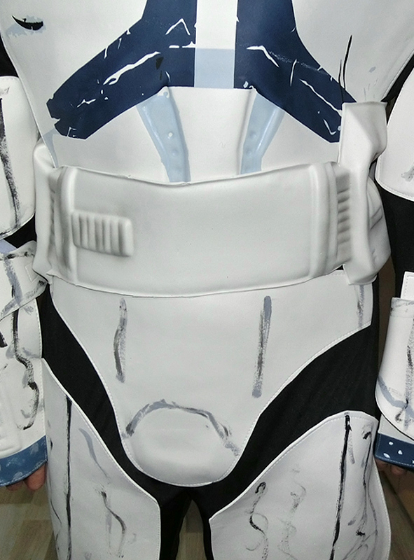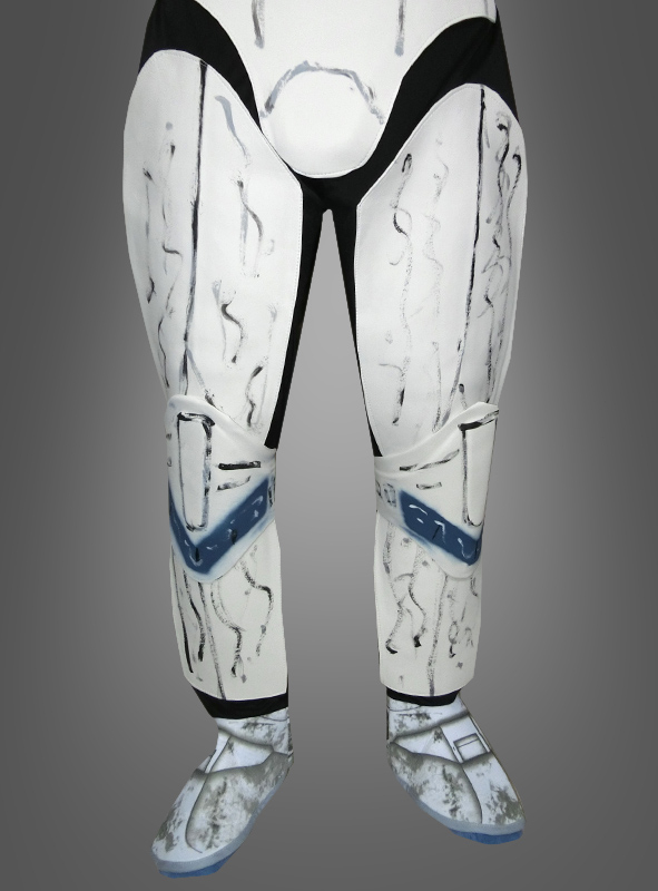 Das original Star Wars Clone Trooper Kostüm besteht aus einem Overall mit EVA Rüstungsteilen aus Schaumstoff und 2-teilige Maske aus Kunststoff in Form eines Vollhelms (Kopf ist vollständig bedeckt). Der ausgeformte Gürtel wird im Rückenbereich gebunden.