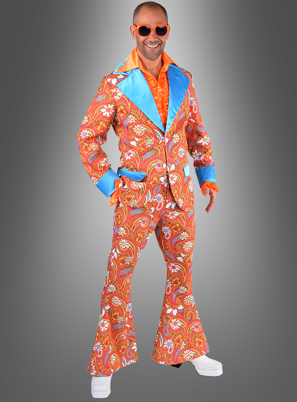 Mit dem bunten Hippie Anzug Schlagerparty für Herren fallen Sie auf der nächsten 70er Jahre Party so richtig auf. Das kunterbunte Paisleymuster ist von weißen Blumen durchzogen und sorgt für gute Laune beim Schlagermove oder dem Dieter Thomas Kuhn Konzert. Die Farben Orange und Braun dominieren.