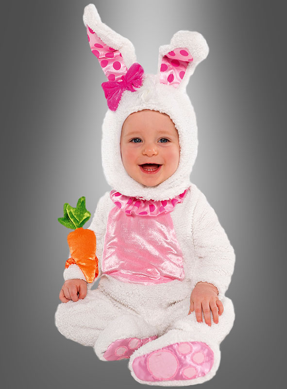 Das zuckersüße Hasenkostüm für kleine Mädchen in weiß und pink ist einfach nur niedlich. Ihr kleiner Schatz wird hellauf begeistert sein, denn eine weiche, samtige Rassel in Form einer Karotte gehört zu diesem bezaubernden Tierkostüm für Babys.