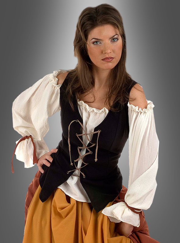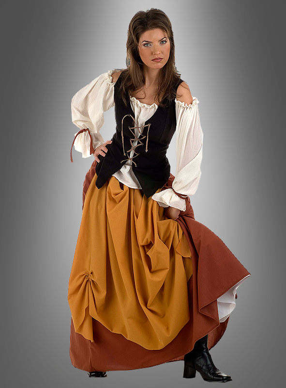Das bequeme Mittelalter Bäuerin Kostüm für Damen besteht aus einem langen Rock und dem Oberteil. Dieses besteht aus einer schwarzen Korsage aus weichem Stoff mit Ösen und Zier-Schnürung vorne. Angenäht ist die woll-weiße Bluse im Crinkle-Look mit Rüschen am Ausschnitt und rotbraunen Bindebändern an den Ärmelabschlüssen. Durch den hohen Baumwollanteil ist das Oberteil sehr angenehm zum Tragen. Der Carmen-Ausschnitt lässt die Blicke auf die unbedeckten Schultern fallen. Gewagt!