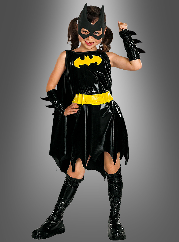Das coole Batman Outfit für Mädchen besteht aus schwarzem Minikleid mit Fledermausumhang, Armstulpen, Augenmaske, Gürtel und Overknee-Stiefelüberziehern.