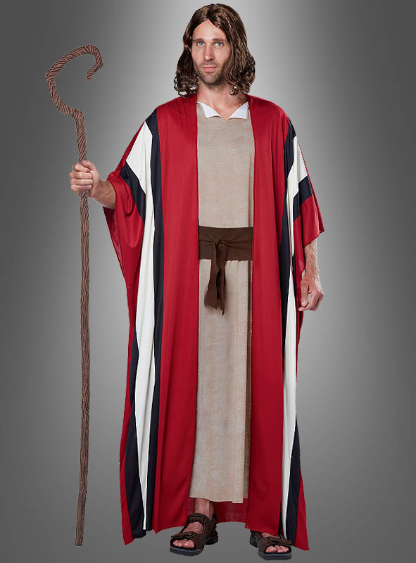Das Männerkostüm ist auch perfekt geeignet für ein Krippenspiel zu Weihnachten. Als Josef, guter Hirte oder als Moses sieht die Gewandung sehr gut aus. Das Karnevalskostüm besteht aus einem langen beigen Gewand mit dunkelbraunem Stoffgürtel. Darüber trägt der Schafhirte eine lange Robe, die vorne offen ist. Die Robe ist rot, hat vorne zwei breite weiße Streifen, die von dunkelblauen Streifen begrenzt sind.