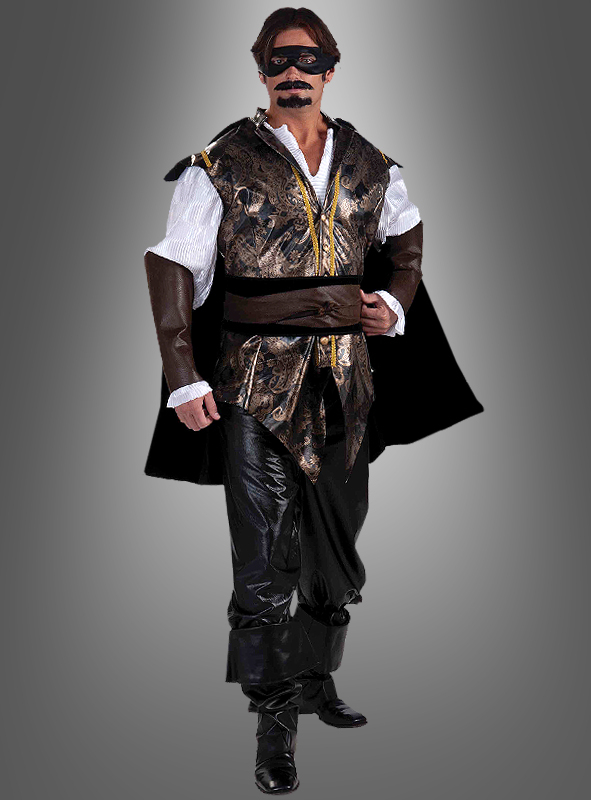Weißes Satinhemd mit schönem Glanz, Weste in schwarz mit goldenem Paisleymuster und angenähtem Umhang. Die Weste ist reich verziert mit goldener Borte Knöpfen. Die schwarze glänzende Kniebundhose hat einen bequemen Gummizug im Bund und Bindebänder in Höhe der Waden. Ein breiter Hüftgürtel, die Armschienen und die Stiefelüberzieher runden das Kostüm ab. Natürlich ist auch die schwarze Augenmaske enthalten, die den charmanten Liebhaber unerkannt bleiben lässt. Sehr schöne Ausführung.