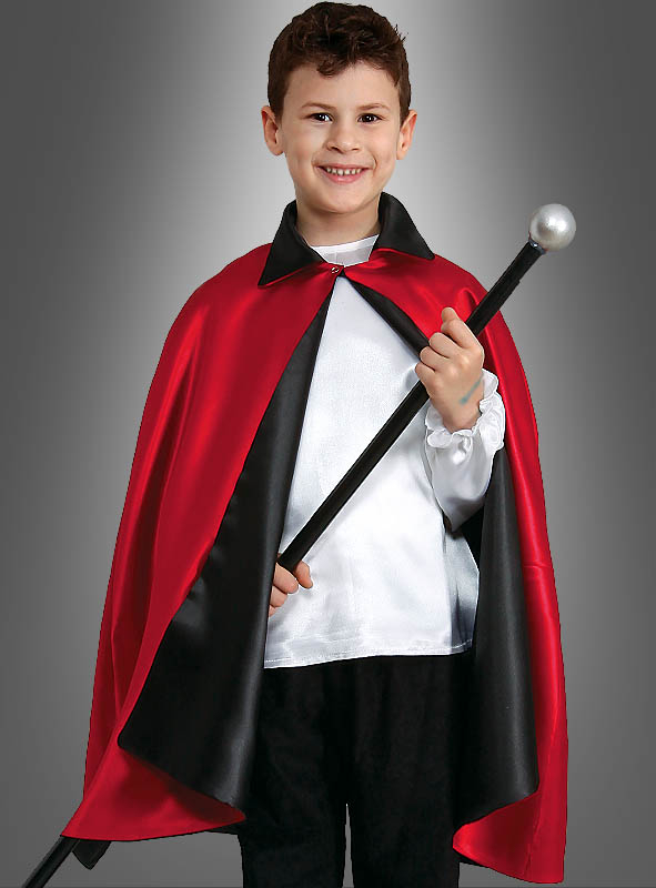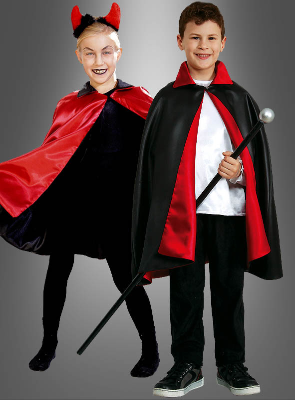 Der Vampirumhang aus hochwertigem Satinstoff für Kinder ist auf einer Seite schwarz und auf der anderen rot. Da es sich um ein Wendecape handelt, kann es beidseitig getragen werden, je nachdem welche Farbe dem kleinen Blutsauger gerade am besten gefällt. Damit der Umhang auch hält, wird er oben mit einem Druckknopf verschlossen.