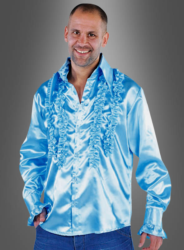 Das Rüschenhemd ist aus glänzendem Satin und toll verarbeitet. Der Kragen ist schön groß, wie es in den 70er Jahren modern war. Die Ärmelabschlüsse bestehen aus engen Manschetten, an deren Saum zusätzlich Rüschen angebracht sind. An beiden Seiten der Brust sind doppelreihig Rüschen aufgenäht. Diese enden oberhalb des Bauchs. In der Mitte neben der Knopfleiste ist das Satinhemd jedoch ohne Rüschen gestaltet. Das trägt nicht so auf und macht eine schlanke Figur.