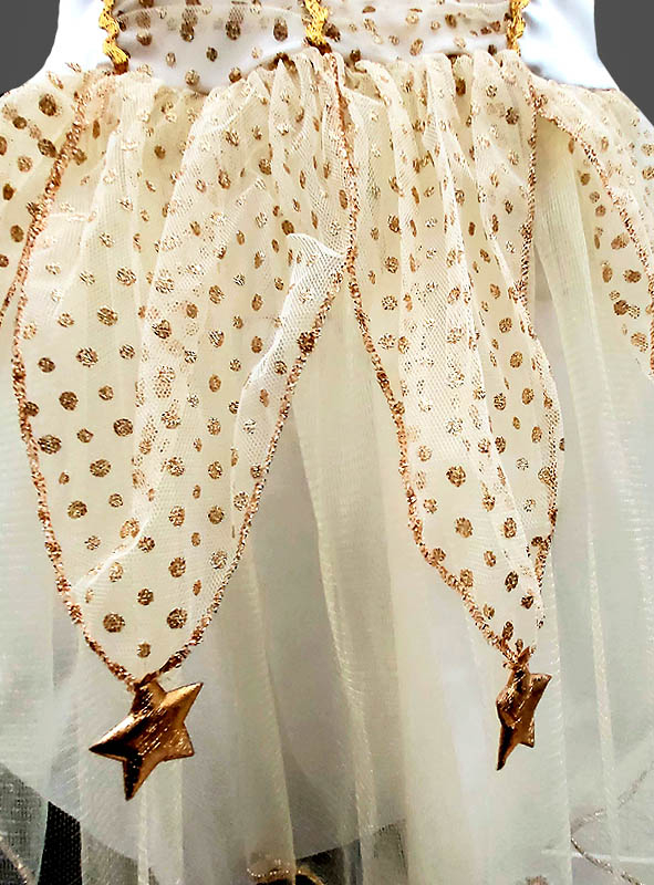 Das goldene Engelskostüm für Mädchen besteht dem Satin Kleid mit Puffärmeln und dem angenähten Tüllröckchen. Auf dem Tüll sind unzählige gold-glitzernde Punkte zu sehen. Goldene Borten an den Säumen und am Kleid sowie toll gepolsterte Sterne aus glänzendem Kunstleder-Imitat verzieren das Kostüm für Mädchen noch zusätzlich. In Rockteil innen ist ein weißer, festerer Stoff für Blickdichte und mehr Weite des Tüllrocks eingenäht.