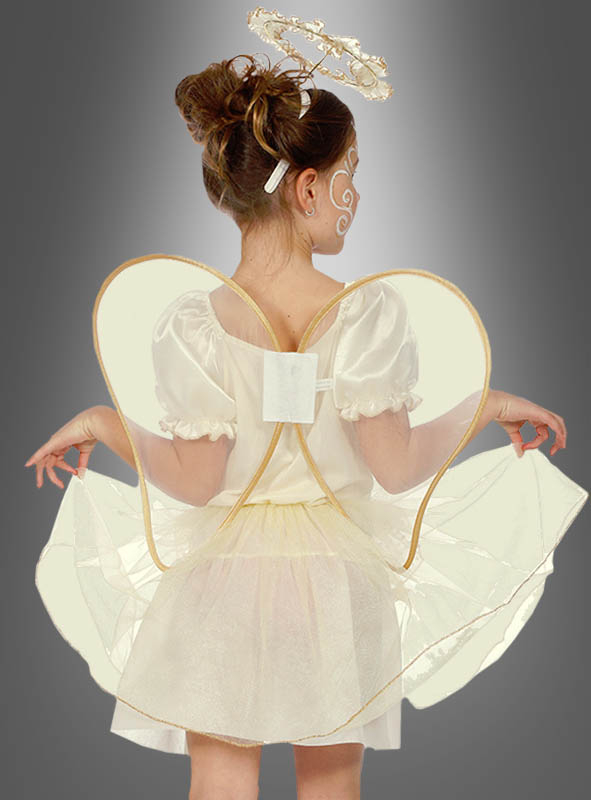 Natürlich sind auch transparente, golden eingefasste Engelsflügel mit dabei. Die leichten Flügel werden hinten am Kleid mit einem großen Patch Klettverschluss angebracht. Der Haarreif mit dem Heiligenschein aus Spitze macht sofort einen wunderschönen Engel aus jedem Kind.