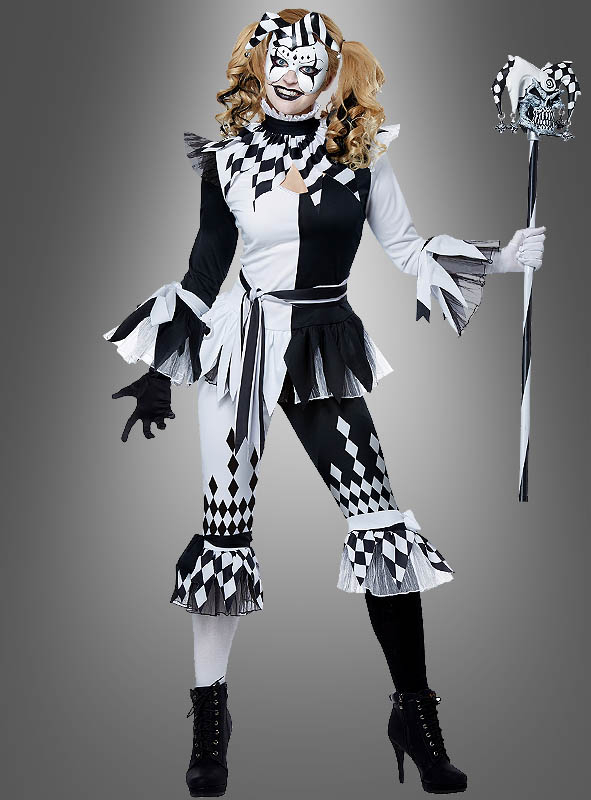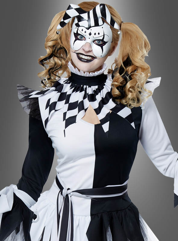 Das Harlekinkostüm für Damen hat viele schöne Details. Die Farben Schwarz und Weiß wechseln sich ab und bilden ein freches Muster über die komplette Verkleidung verteilt.