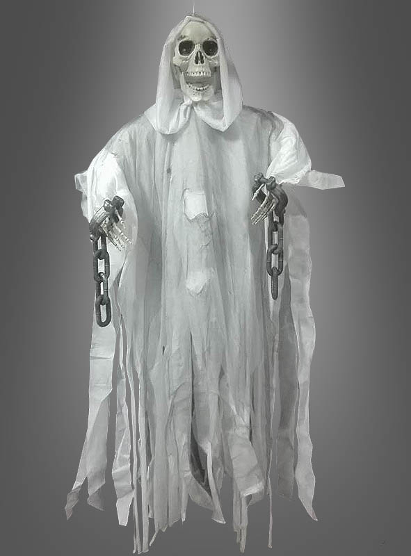 wenn das 160 cm große Skelett Gespenst loslegt, wird so mancher einen Schrecken erleben. Der weiße Geist heult und gibt schaurige Geräusche von sich. Dabei bewegt er den Kopf und die Arme und sieht aus, als ob er wieder lebendig geworden ist. Die Arme mit den herabhängenden Ketten können Sie in die gewünschte Position biegen. So sieht der heulende, weiße Geist immer wieder anders aus.