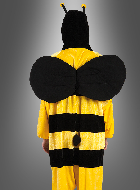 Der Overall ist aus weichem Samtstoff genäht. Die Kapuze mit dem witzigen Bienengesicht und den Fühlern ist angenäht. Vorne hat der Anzug einen langen Reißverschluss und seitlich Taschen. Die Flügel sind angenäht und am Ärmel- und Beinabschluss ist ein Gummizug eingenäht.