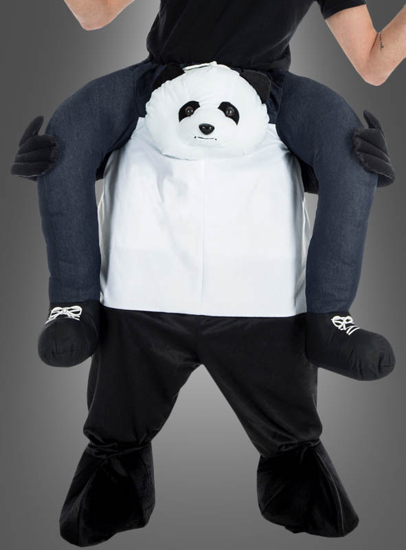 Der lustige Huckepack Panda besteht aus einer Hose mit ausgepolsterten zusätzlichen Beinen und Händen an der Seite, so dass man wirklich den Eindruck vermittelt bekommt, dass der Bär Sie trägt. Eine tolle optische Täuschung. Ihre eigenen Beine stecken natürlich in den Beinen des Pandas. Die Hose hat angenähte Schuhüberzieher, so dass Ihre Füße verdeckt sind. Das Material des Karneval Kostüm Huckepack ist im Bereich des Pandabären schön weich. Der gepolsterte Kopf mit Kunststoffaugen und -nase ist liebevoll gestaltet und erinnert an ein Plüschtier.