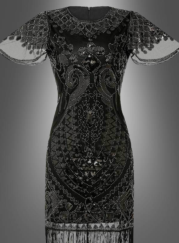Das schöne Paillettenkleid mit Fransen hat leicht transparente Flügelärmel, die die Oberarme bedecken. Das schöne Paillettenmuster ist auf Tüll aufgenäht, dass sich wie eine leichte Schicht um das blickdichte Kleid legt. Auch auf der Rückseite ist das Kleid genauso schön, wie vorne. In einem der Kurzarm 20er Jahre Kleider hier werden Sie von allen Seiten funkeln und glänzen. Das Kleid ist kurz geschnitten, aber durch die längeren Fransen optisch verlängert. Ein Reißverschluss erleichtert das Ankleiden. Das figurbetonte Kleid macht eine echte Diva aus Ihnen.