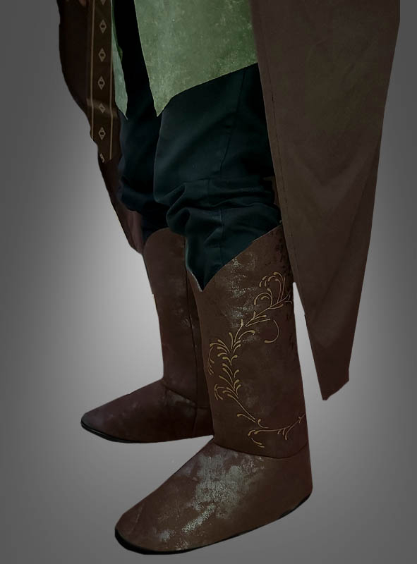 Dieses Original Filmkostüm besteht aus vier Teilen. Die lange Tunika ist vorne offen und wird mit einem Bändel oben verschlossen. Sie ist aus samtig weichem Velours in Wildlederoptik gearbeitet. Sie ist in dunklem Grün und Braun gehalten und hat lange Ärmel. Rankenmuster sind in den braunen Parts eingearbeitet. Mit dem Stoffgürtel, der ebenfalls mit den schönen Rankenmuster verziert ist, wird die offene Tunika zusätzlich zusammengehalten. Über der Tunika trägt Legolas einen braunen Kapuzenumhang, der mit einem Band umgebunden wird. Komplett wird das Elbenkostüm aber erst durch die schönen Stiefelüberzieher aus gepolstertem Stoff in Wildlederoptik. Seitlich wiederholt sich hier das Rankenmuster.