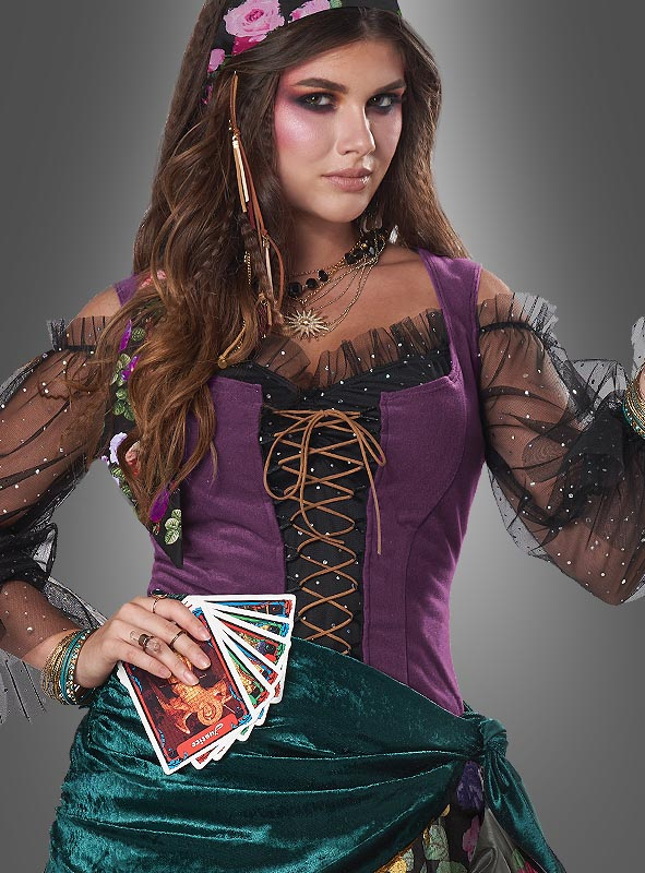 Der Rock ist in drei Bahnen genäht. Hier wechselt sich schwarzer Stoff mit Rosenmuster in verschiedenen Lila- und Weißtönen ab. An einer angenähten Schlaufe kann der Rock an einer Seite provokant hochgebunden werden. Ebenfalls mit im Lieferumfang enthalten ist das Haarband mit dem gleichen Rosenmuster. Das petrolfarbene Hüfttuch mit angenähten Goldmünzen bildet einen schönen Farbkontrast zum Schwarz und Lila des restlichen Kostüms. Damit Sie auch richtig wahrsagen können, sind sechs übergroße Tarotkarten mit dabei.