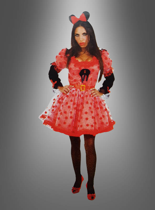 Das rote Maus Kleid erinnert leicht an die 60er Jahre, mit dem kurzen weiten Petticoat Rock. Das Kleid besteht aus einem roten Satinstoff, darüber ist ein weicher Tüll mit großen roten Punkten genäht. An den kurzen Ärmeln ist noch ein schwarzer Samt vernäht. Für die Illusion der schwarzen Arme. Am Abschluss mit schwarzer Spitzer verziert. Überall finden Sie kleine Schleifchen. Es ist ein rundum gelungenes Kostüm. Der süße Haarreif mit den schwarzen Mausohren und der roten Schleife rundet das Kostüm perfekt ab.