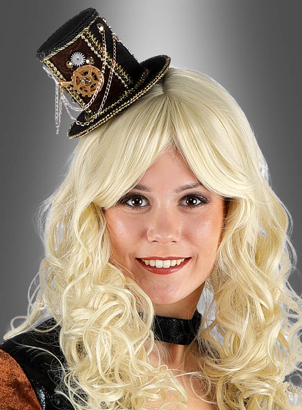 Bei Steampunk Kostümen sind Zylinder nicht nur bei Herren sehr beliebt. Damen tragen die Steampunk Zylinder in Miniaturformat zum langen viktorianischen Kleid.
