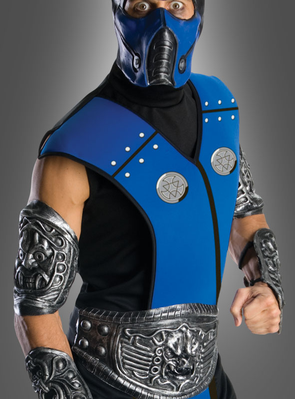 Das Ninja Kostüm von Sub-Zero besteht aus einem ärmellosen schwarzen Overall. Vorne ist ein gepolsterter und bedruckter Waffenrock in blau angenäht. Die Halbmaske aus Latex hat hinten einen Gummi zur Befestigung. Der Gürtel, die vier Armteile und zwei Beinschienen sind EVA Schaumstoff in 3-D gefertigt. Durch die tolle Gestaltung in Silber und Schwarz bekommen diese Rüstungsteile einen tollen Metall-Effekt.