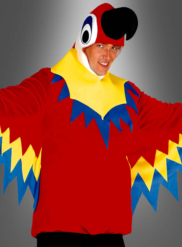 Im Papageienkostüm fühlen Sie sich wohl. Das Kostüm ist ganz in Rot, Blau und Gelb gehalten. Nur das Gesicht ist weiß, Füße, Schnabel und Augen schwarz. Das Oberteil besteht aus einer roten Tunika aus Samtstoff, die am Vorder- und Rückenteil mit weichem Schaumstoff unterpolstert ist. Am unteren Saum ist ein Gummizug eingenäht. An den Ärmeln sind die Flügel aus fließendfallendem Stoff angenäht. Wenn Sie die Arme heben, sieht man die bunten Schwingen. Auch die lange Schwanzfeder aus drei Lagen Stoff ist hinten angenäht. Am vorderen Halsausschnitt befindet sich ein blauer zackig geschnittener Latz. Darüber wird der Papageienkopf wie eine Kapuze mit kurzem gelben Kragen getragen. Der schwarze Schnabel ist gepolstert für guten Stand. Mit im Lieferumfang sind auch die schwarzen Schuhüberzieher aus Kunstleder.