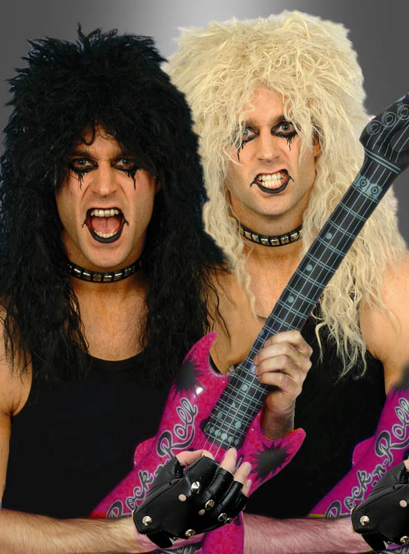 Das Rocker 80er Jahre Heavy Metal Set mit wilder Langhaar Perücke, aufblasbarer Luftgitarre, Nietenhandschuhe und Nietenhalsband ist ein echter Renner für alle Rockstars auf der nächsten Mottoparty. Sie brauchen nur noch Jeans, ein T-Shirt und Turnschuhe und es kann gerockt werden.
