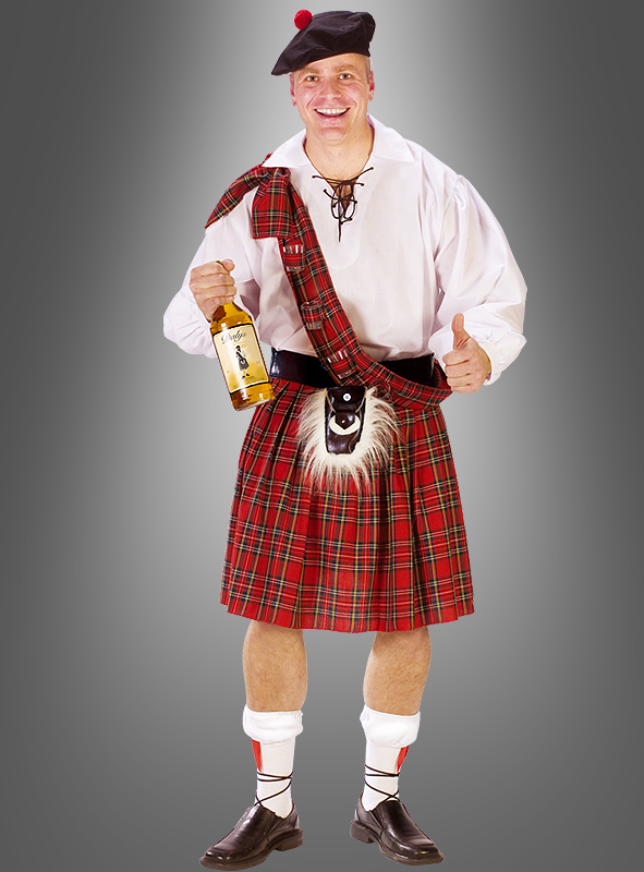 Lieferumfang: Schottenrock, Hemd, Mütze, Gürtel mit Fellbeutel und Schärpe mit 4 Kunststoff-Schnaps-Gläsern.