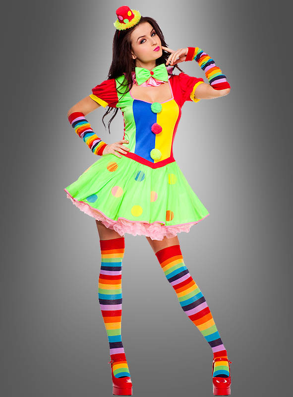 Das kunterbunte Kleid hat auf der Vorderseite angenähte Pompons und ist aus bequemem dehnbarem Stoff gefertigt. Der Rockbereich ist zweilagig aus Stoff mit bunten Punkten, die obere Lage ist aus grünem, weichem Tüll. Der separate Kragen mit der grünen Schleife wird mit einem Klettverschluss befestigt. Der Minizylinder wird auf einen beiliegenden Haarreif geschoben. Die Regenbogen-Kniestrümpfe sind ebenfalls dabei. Sie sind extra eng anliegend, um das Runterrutschen zu vermeiden.