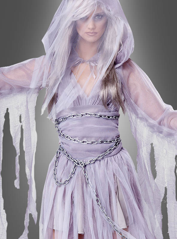 Das Geist Kostüm für Damen besteht aus einem grauen Kleid aus bequem dehnbarem Stoff. Das Kleid ist vorne mit weißem Tüll überzogen und im Rockbereich sind mehrere Lagen aus Tüllstreifen fetzig aufgenäht.