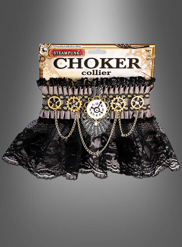 Das tolle Halsband für Damen besteht aus schwarzer Spitze, die mit schwarzem Filzstoff unterlegt wurde. Dies bildet nicht nur einen hübschen Kontrast, sondern macht die Zahnräder-Kette angenehm zu tragen. Als weiteres fantasievolles Detail wurde ein Stoffband in braun-grau gesmokt und bildet den Rahmen für die ausgefallenen Anhänger. Eine Medaille mit weißem Ziffernblatt schmückt das Collier in der Mitte. Rechts und links davon sind je zwei Zahnräder angebracht, die durch ein goldfarbenes Kettchen miteinander verbunden sind. Das Kropfband ist im Nacken mit einer Kette versehen und wird mit einem Karabiner verschlossen. Somit ist der Umfang einstellbar. Die Zahnräderkette für Steampunkfans ist im viktorianischen Stil gestaltet und einfach ein Eyecatcher.