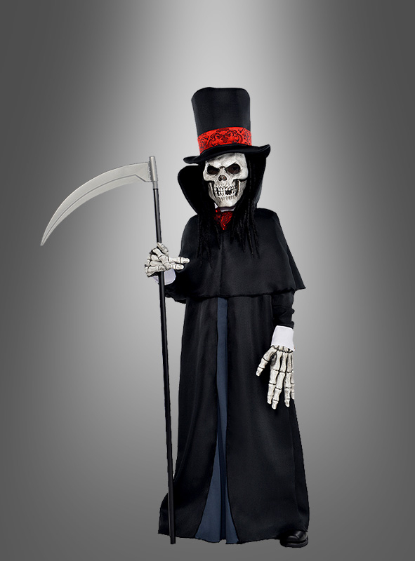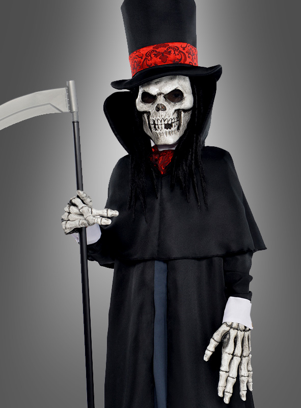 Das Totengräber Kostüm für Kinder ist eine elegante Variation des Sensenmanns oder Gevatter Tod. Er hat sich extra schick gemacht, um die Seelen der Verstorbenen ins Jenseits zu geleiten. Ein tolles Komplettkostüm für Kinder – nicht nur an Halloween.