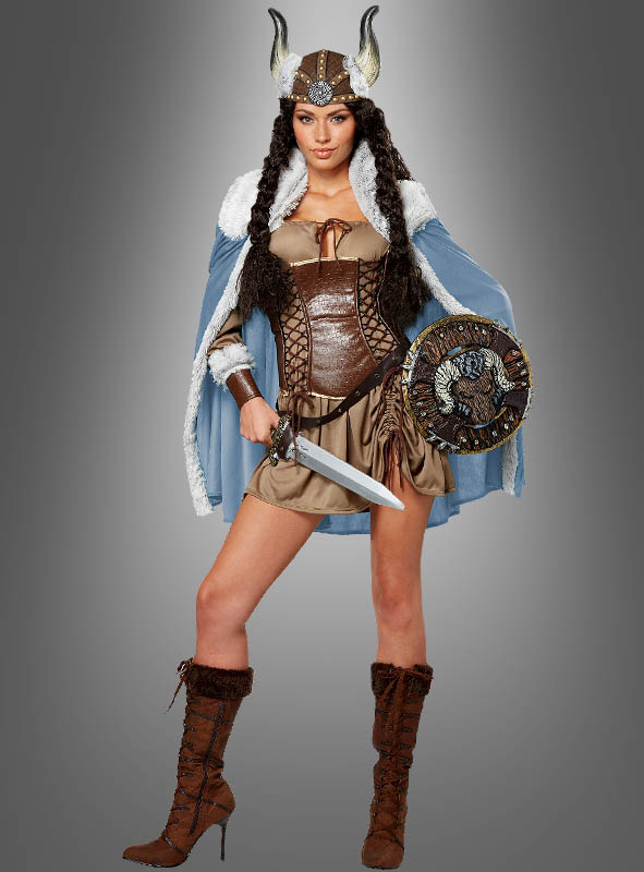 Der blaue Umhang ist mit kuschelweichem grauem Kunstfell besetzt und wird mit zwei Klettverschlüssen am Kleid befestigt. Die tollen Armstulpen sind ebenfalls wie die Korsage aus Kunstleder und zusätzlich mit Kunstfell besetzt. Ein schmaler Gürtel mit Ösen und Schlaufe für ein Schwert trägt die Wikingerin um die schlanke Taille.