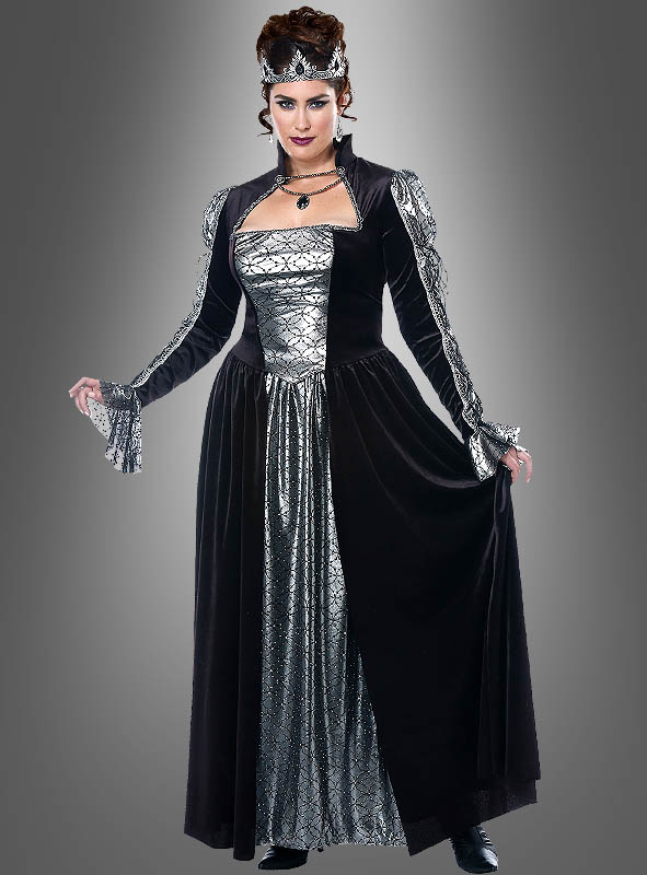Das Königinnen Kostüm fällt durch seinen ausgefallenen Schnitt auf. Das schwarze Samtkleid mit angenähtem Kragen hat einen sehr ausgefallenen Ausschnitt. Im vorderen Bereich ist ein sehr schöner silberfarbener Stoff mit schwarzem Ornament-Muster eingenäht. Im Oberteil sind Stäbchen eingearbeitet, die für mehr Halt und Stabilität sorgen.